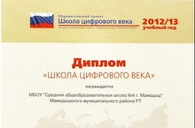 Дипломом награждается наша школа за участие в Общероссийском проекте "Школа цифрового века", разработанном в соответствии с Федеральной целевой программой развития системы образования на 2011-2015 годы и направленном на комплексное обеспечение образовательных учреждений цифровыми предметно-методическими материалами и дистанционными образовательными ресурсами для повышения профессионального уровня педагогических работников, за использование педагогическим коллективом образовательного учреждения возможностей современных информационных технологий и цифровых предметно-методических материалов, представленных в рамках проекта.