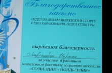 Выражают благодарность Мардановой Н (1 класс), Абдуллину И (2 класс), Мухлисовой Т.(6 класс), Шайдуллиной Э (10класс) за участие в районном молодежном фестивале эстрадного искусства "Созвездие-Йолдызлык-2014"