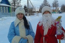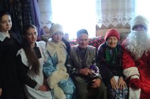 Мәктәп укучылары һәм Кыш бабай,Кар кызы сугыш ветераны Ахметзянов Файзрахман бабайны Яңа ел белән котлый.