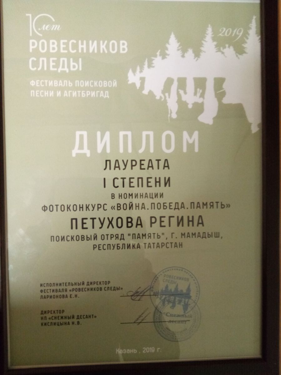 С 29 ноября по 01 декабря 2019 г в г. Казани прошел X Межрегиональный фестиваль поисковой песни и агитбригад «Ровесников следы». В очном туре фестиваля приняли участие более 200 ребят из 13 регионов России. На суд жюри были представлены номера из номинаций "Военно-патриотическая песня", "Поисковая песня", "Авторская песня", "Агитбригада" и "Художественное слово" поисковиками из Республик Татарстан, Чувашия, Мордовия, городов Санкт-Петербурга, Кемерова, Ярославля, Владимира, Нижнего Новгорода, Перми и другие. Поисковиками отряда «Память» была заявлена песня «Уходят солдаты» в исполнении автора Виктора Крошечкина. В номиниции «Художественное слова» в очный тур прошли 34 конкурсанта. «Баллада о матере» О. Киевской в прочтении Шафиковой Альфии звучала в полной тишине, она не оставила равнодушными никого в зале. Главного успеха поисковики добились в новой номинации фестиваля «Фотоконкурс "Война. Победа. Память"!» Активист отряда Петухова Регина была награждена дипломом лауреата I степени. Награждение состоялось в детском центре «Экият» во время проведения гала-концерта фестиваля.