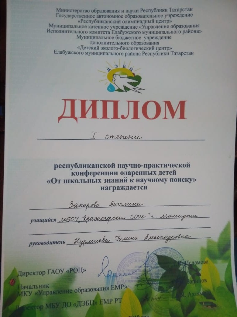25 гыйнварда «Экознайка» берләшмәсендә тәрбияләнүче Захарова Ангелина (җит. Нурмиева Г. А.) сәләтле балаларның «мәктәп белеменнән фәнни эзләнүгә» Республика фәнни-гамәли конференциясендә катнашты һәм 1 урынны алды. Котлыйбыз һәм киләчәктә дә уңышлар телибез.