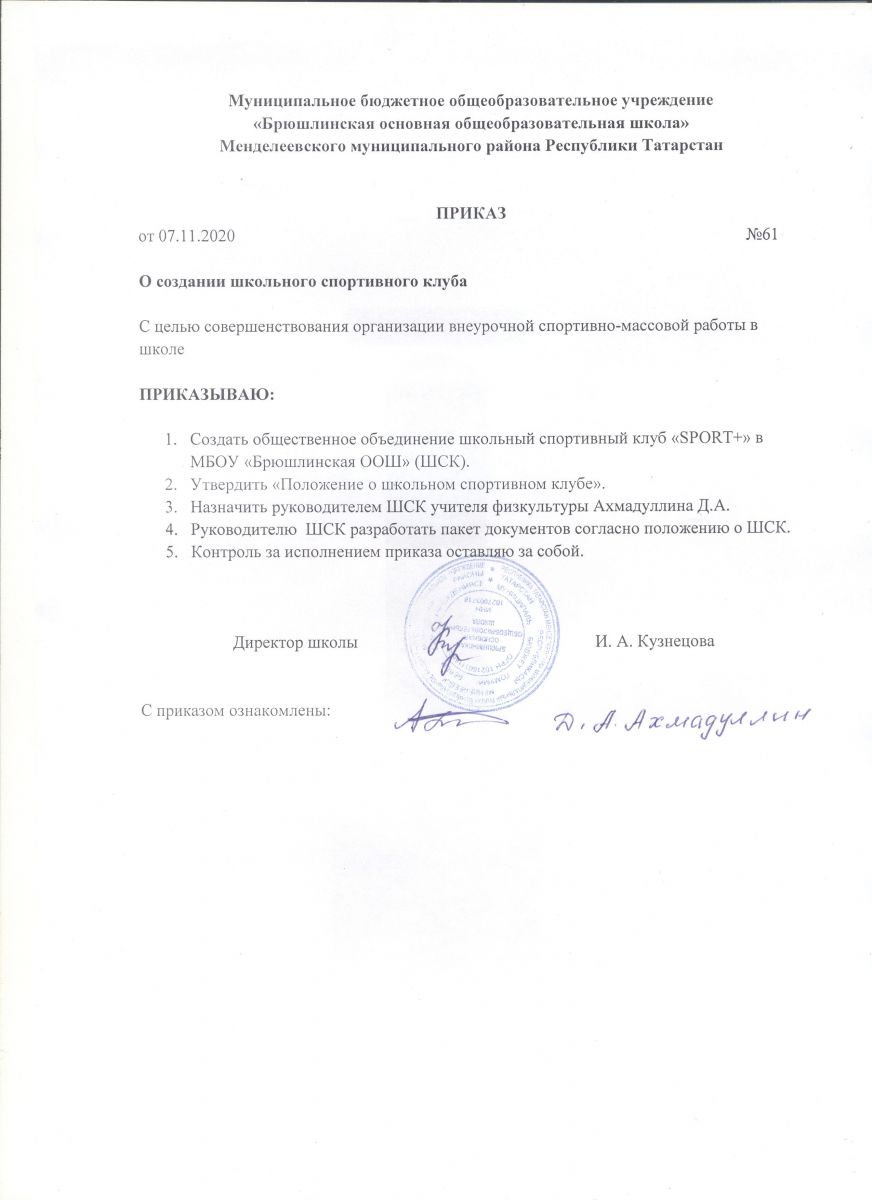 Приказ об организации работы ШСК "СПОРТ+" в 2025-2026 учебном году