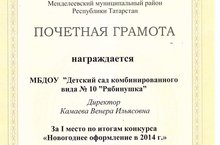 С 17.11 по 28.11.2014г в МБДОУ №10 «Рябинушка» реализован проект в «В дружной семье счастливый малыш». Целью которого являлось содействовать гармонизации отношений в детско - взрослом сообществе детского сада. Проведены различные мероприятия совместно с родителями. /17 нче ноябрьдән 28 нче ноябрьгә кадәр унынчы балалар бакчасында "Дус яшәгән гаиләдә бәхетле бала үсә" дигән проект үтте. Проектның төп максаты-балалар һәм олылыр арасында татулык тәрбияләү. Атна буе бакчада төрле конкурслар, уеннар, бәйрәмнәр оештырылды. Проект бик күңелле үтте. 04.12.2014