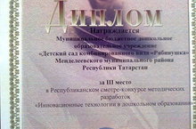 МБДОУ №10 обладатели почётного 3-го места на республиканском смотре-конкурсе методических разработок среди педагогов и коллективов ДОУ РТ «Инновационные технологии в дошкольном образовании». 19.06.2014