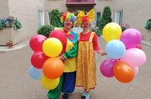 Сегодня на территории детского сада звучит весёлая музыка, а ребят встречают два смешных колуна Ириска и Клёпа, они дарили всем шары с пожеланиями хорошего лета....