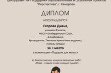 1 место в номинации «Подарок для мамы» во Всероссийском конкурсе творческих работ 27.12.2025 Егорова Диана , ученица 8 класса заняла 1 место в номинации «Подарок для мамы» во Всероссийском конкурсе творческих работ «Мама - главное слово в каждой судьбе!». Мы также выражаем благодарность руководителю Дианы, учителю истории Тихоновой Ирине Александровне, за поддержку и наставничество. Молодцы!!!