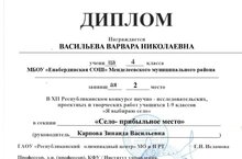 "Я выбираю село!"/"Мин авылны сайлыйм!" 15.03.2022 14 февраля прошел заключительный этап Республиканского конкурса научно-исследовательских, проектных и творческих работ учащихся в рамках проекта «Я выбираю село».Конкурс направлен на выявление одарённых детей, поддержку детского творчества в области изучения природы, истории, этнографии родного края, привлечение внимания школьников к профессиям работников сельского хозяйства, распространение педагогического опыта в изучении традиций и культуры своего народа. По итогам работы конкурса в номинации "Село-прибыльное место" были награждены дипломами ученики нашей школы: Махмудова Зарина Эльдаровна, ученица 3 класса занявшая 3 место! Руководитель Скворцова Лариса Николаевна. Васильева Варвара Николаевна , ученица 4 класса занявшее 2 место! Руководитель Карпова Зинаида Васильевна. Поздравляем!!!