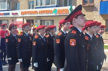 Юнармейский отряд школы под командованием 11классника Артамонова Ильяса на торжественном параде, посвящённом 77 годовщине победы в ВОВ