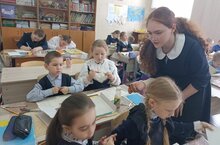 Ученицы 5а класса Валиуллина Виктория, Гвоздь Арина и Минабутдинова Самира провели мастер-класс в 1а классе по изготовлению открытки к 9 мая