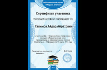 Участник I Всероссийского творческого конкурса "Патриотический слог" интернет-портала"Кладезь знаний" Галимов Айдар награжден сертификатом.