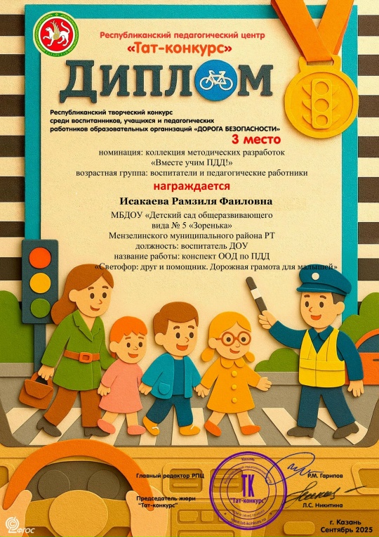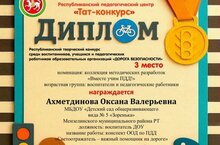 Воспитатели Ахметдинова Оксана Валерьевна и Исакаева Рамзиля Фаиловна участвовали в Республиканском творческом конкурсе среди воспитанников, учащихся и педагогических работников образования "Дорога безопасности" и заняли призовые места в номинации "Коллекция методических разработок "Вместе учим ПДД !"