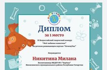 Воспитанница МБДОУ номер 7 БЕРЕЗКА Никитина Милана приняла участие в ||| всероссийском творческом конкурсе "Мое любимое животное" на детском развивающем портале "Почемучка" и была награждена дипломом за 1 место в номинации "Фотография". Руководитель: Хуснутдинова Л.И