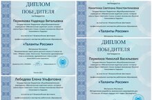 Наши педагоги Лебедева Е.У.,Пермякова Н.В.,Никитина С.К. и Пермяков Н.В. участвовали во втором Всероссийском фестивале профессионального мастерства работников образования « Таланты России» и стали победителями.
