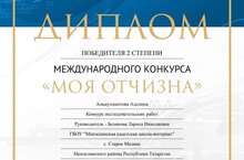 Ученица 8 кл. Альмухаметова Аделина (учитель Белякова Л.Н.) приняла участие в Международном конкурсе "Моя Отчизна", проводимой АНЭ в номинации конкурс исследовательских работ и награждена Дипломом 2 степени.