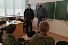 Встреча в рамках по профорентационной работе с начальником ПЦО ОВО по Мензелинской району лейтенант ом полиции Мифтаховым А. И . и командиром отделения ОВО прапорщик ом полиции Фёдоров А. В.
