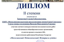 В конкурсе поисково-исследовательских работ среди обучающихся общеобразовательных организаций, студентов среднего и высшего ПО, педагогических работников Республики Татарстан «Мензелинский! Педагогический! История и судьбы!» было рассмотрено 89 работ. Из нашей школы учитель татарского языка и литературы Хамматова Гузалия Габделахатовна заняла II место и награждена дипломам II степени. Поздравляем!!!