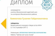 Редакция журнала «Гаилә һәм мәктәп» и филиал АО «ТАТМЕДИА» – редакция журнала «Мәгариф» ежемесячно проводят всероссийский конкурс «Зирәк остаз», который направлен на поощрение творческих способностей и художественных талантов работников системы образования. Учитель татарского языка и литературы Хамматова Гузалия Габделахатовна стала победителем Всероссийского конкурса «Зирәк остаз-XXIII» в номинации «Литературное творчество и журналистика». Поздравляем и желаем творческих успехов!!!