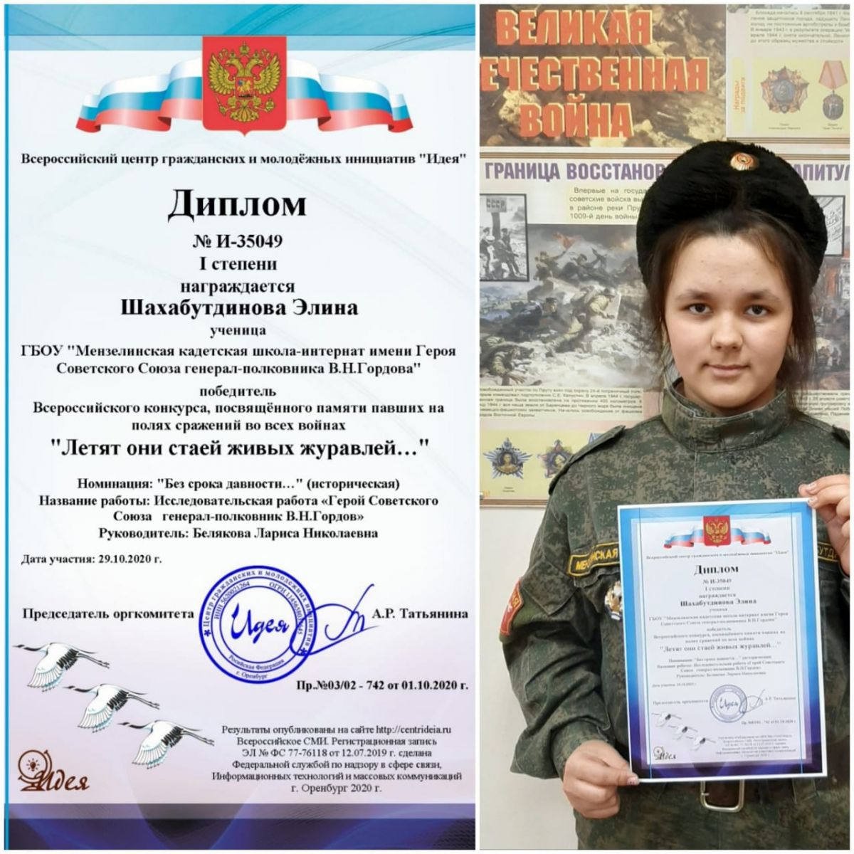 Опубликовано: 23.11.2020Ученица 7 кл Шахабутдинова Элина награждена Дипломом 1 степени за исследовательскую работу во Всероссийском конкурсе "Летят они стаей живых журавлей". Также ученица 7 кл Альмухаметова Аделина награждена Дипломом ( 2 место) за творческую работу во Всероссийском конкурсе "Родина: Патриотизм, Гражданственность, Толерантность-2020".