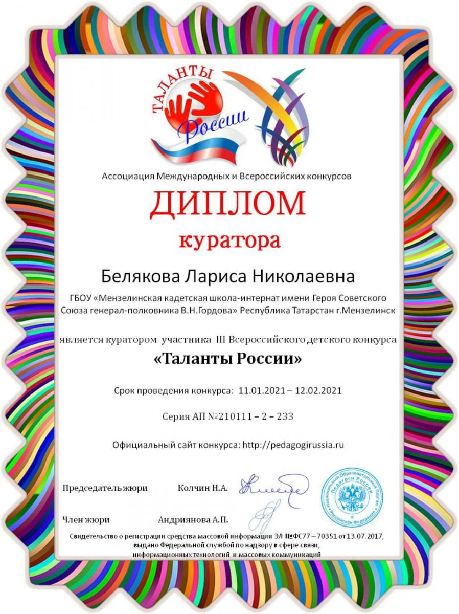 Опубликовано: 22.01.2021Никитина Елизавета, ученица 7 кл (учитель Беляков Л.Н) приняла участие в lll Всероссийском детском конкурсе " Таланты России".