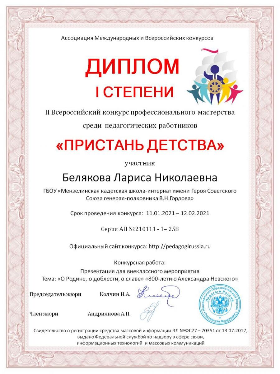 Опубликовано: 23.01.2021Учитель истории и обществознания Белякова Л.Н.приняла участие во ll Всероссийском конкурсе профессионального мастерства среди педагогических работников.