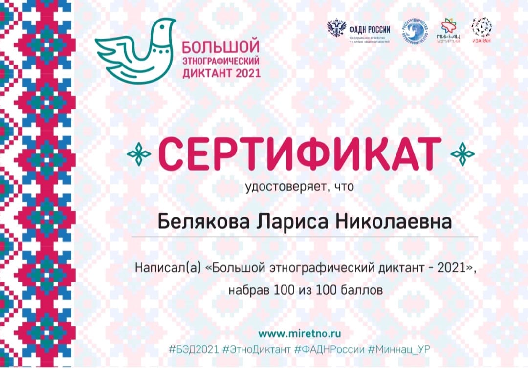 Опубликовано: 05.11.2021Народов много - страна одна! Под таким лозунгом уже в шестой раз проходит Международная просветительская акция "Большой этнографический диктант" с 3 по 7 ноября 2021 года в онлайн-формате и приурочена ко Дню Народного Единства. Цель диктанта - оценить уровень этнографической грамотности населения, их знания о народах,проживающих в России, но и привлечь внимание широкой общественности к вопросам межнационального мира и согласия. В ГБОУ " Мензелинская школа- интернат учителя истории и обществознания Анастасьева О.М.,Белякова Л.Н. и учащиеся 6-11 кл приняли участие в данной акции.