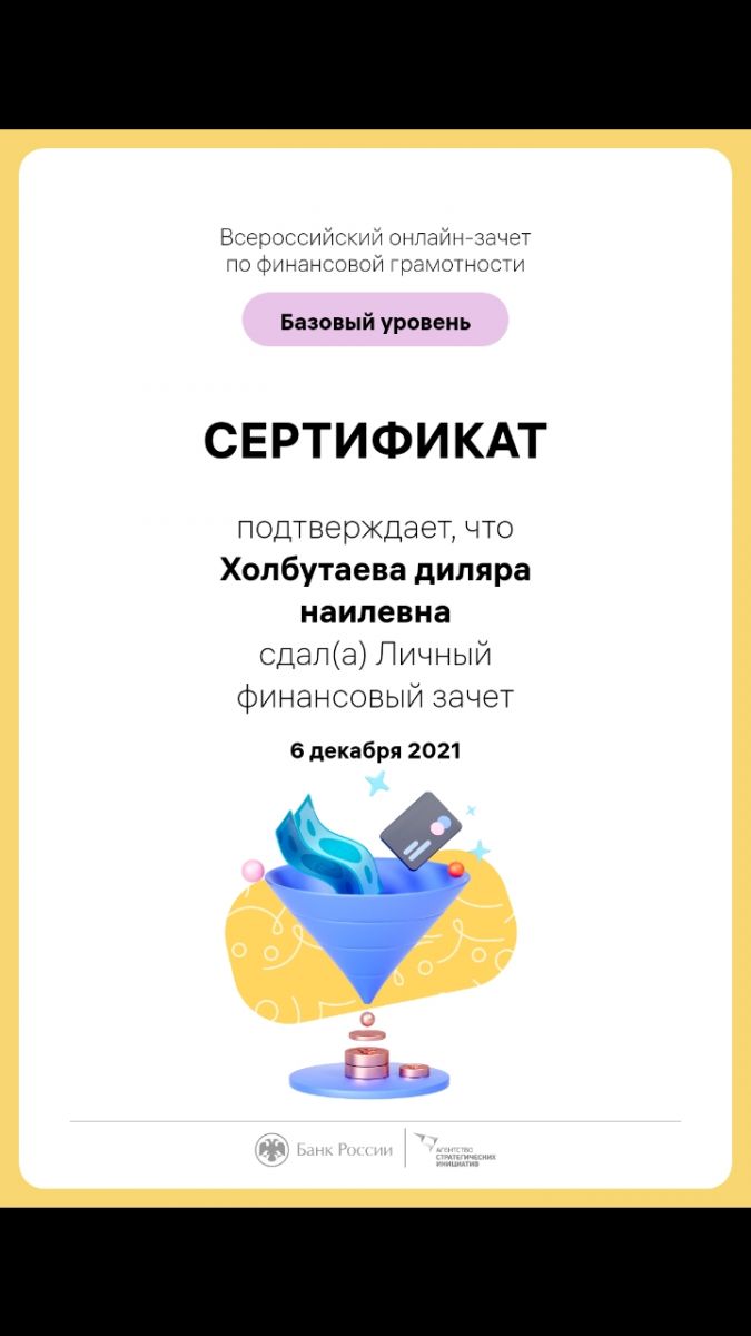 2021 елның 30 ноябреннән 16 декабренә кадәр Россия Банкы Стратегик инициативалар агентлыгы белән берлектә халык һәм эшкуарлар өчен финанс грамоталылыгы буенча дүртенче Бөтенроссия онлайн-зачетын уздыра. Теләге булган һәр кеше финанс мәсьәләләрендә аның ни дәрәҗәдә яхшы ориентлашуын тикшерергә һәм финанс грамоталылыгын арттырырга ярдәм итәчәк шәхси киңәшләр алырга мөмкин. Безнең мәктәптә тарих һәм җәмгыять белеме укытучылары (Анастасьева О. М., Белякова Л. Н.) һәм 9-11 сыйныф укучылары Финанс грамоталылыгы буенча бөтенроссия онлайн - зачетында катнаштылар.