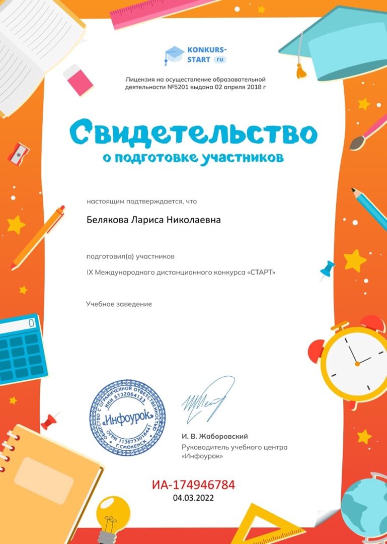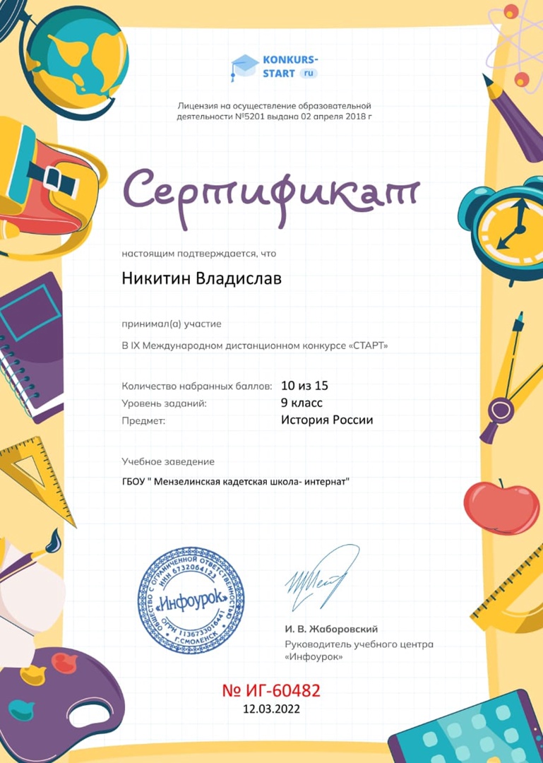 5 нче марттан 13 нче мартка кадәр 6-9 нчы сыйныф кадетлары тарих фәненнән "Старт" IX халыкара дистанцион конкурсында катнаштылар. Конкурс нәтиҗәләре буенча бүләкләнде: I дәрәҗә Диплом- Елшина Ю(6 кл), Пугачев М(7кл). 2 дәрәҗә Диплом- Никитина Е(8кл) 3 дәрәҗә Диплом- Лебедев М(6кл),Кучина Е (7кл), Кузнецова А (8кл). Сертификат-Огорельцев М (7кл),Лебедев Б(8 кл), Никитин В (9 кл).