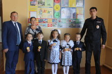 Участковый и руководитель отряда ЮИД раздали первоклассникам светоотражающие элементы.