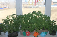 Учащиеся начальных класоов офомили свой огород на подоконнике.