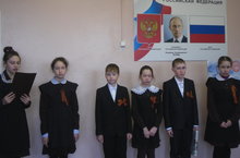 На общешкольной линейке учащиеся 5 класса выступили по теме "Георгиевская ленточка", где рассказали об истории, значении и способах завязывания ленточки.