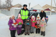 Сегодня с детьми старшей группы вышли в сопровождении инспектора ГИБДД Ибрагимова Н.З.на профилактическую акцию "Зимние каникулы"