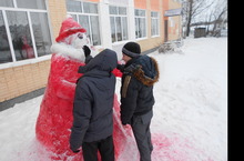 Учащиеся с удовольствием лепят снежные фигуры для встречи Нового года. Дед Мороз -самая главная и большая фигура, ее доверили учащимся 9 класса.