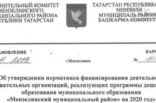 "Об утверждении нормативов финансировании деятельности образовательных организации, реализующих программ дошкольного образования муниципального образования "Мензелинский муниципальный район" на 2020 год"/ "2020 елга" Минзәлә муниципаль районы" муниципаль берәмлегенең мәктәпкәчә белем бирү программаларын гамәлгә ашыручы мәгариф оешмалары эшчәнлеген финанслау нормативларын раслау турында"" 20.01.2020