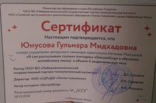 Сегодня наш воспитатель по обучению английскому языку Юнусова Г.М. приняла участие в семинаре - практикуме Наталии Малкиной "Я сам рассказываю сказки" (методика "Storytelling" в обучении английскому языку) в объеме 4 академических часа в ГАОУ ВО "Набережночелнинский государственный торгово-технологический институт" АНО "Семейный центр развития и дополнительного образования "Умное поколение"" города Набережные Челны.