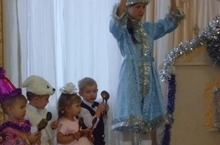 В средней группе «Улыбка» на новогоднем утреннике «Снегурочка и медведь» дети вместе с героями попали в сказочный терем.