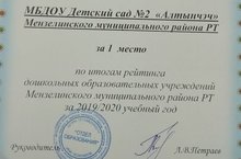 2019-2020 уку елы өчен рейтинг нәтиҗәләре буенча 2 нче "Алтынчәч" балалар бакчасы мәктәпкәчә белем бирү учреждениеләре арасында 1 нче урынны алды.