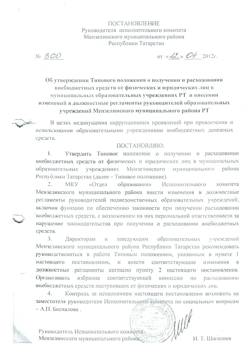 Типовое положение о получении и расходовании внебюджетных средств от физических и юридических лиц в муниципальных образовательных учреждениях РТ >>>