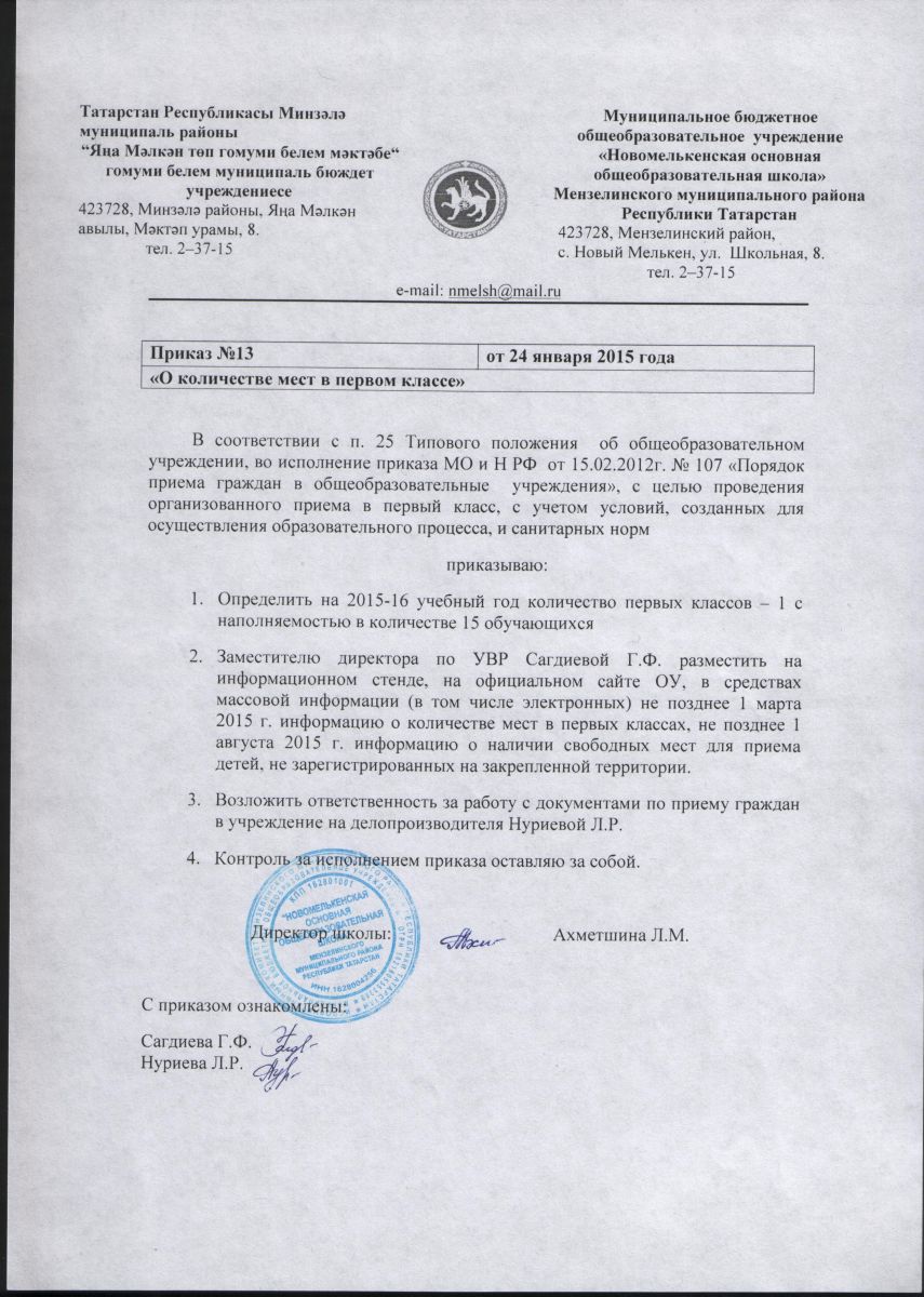 Приказ МБОУ Новомелькенская ООШ "О количестве мест в первом классе" 2015-2016 уч.год