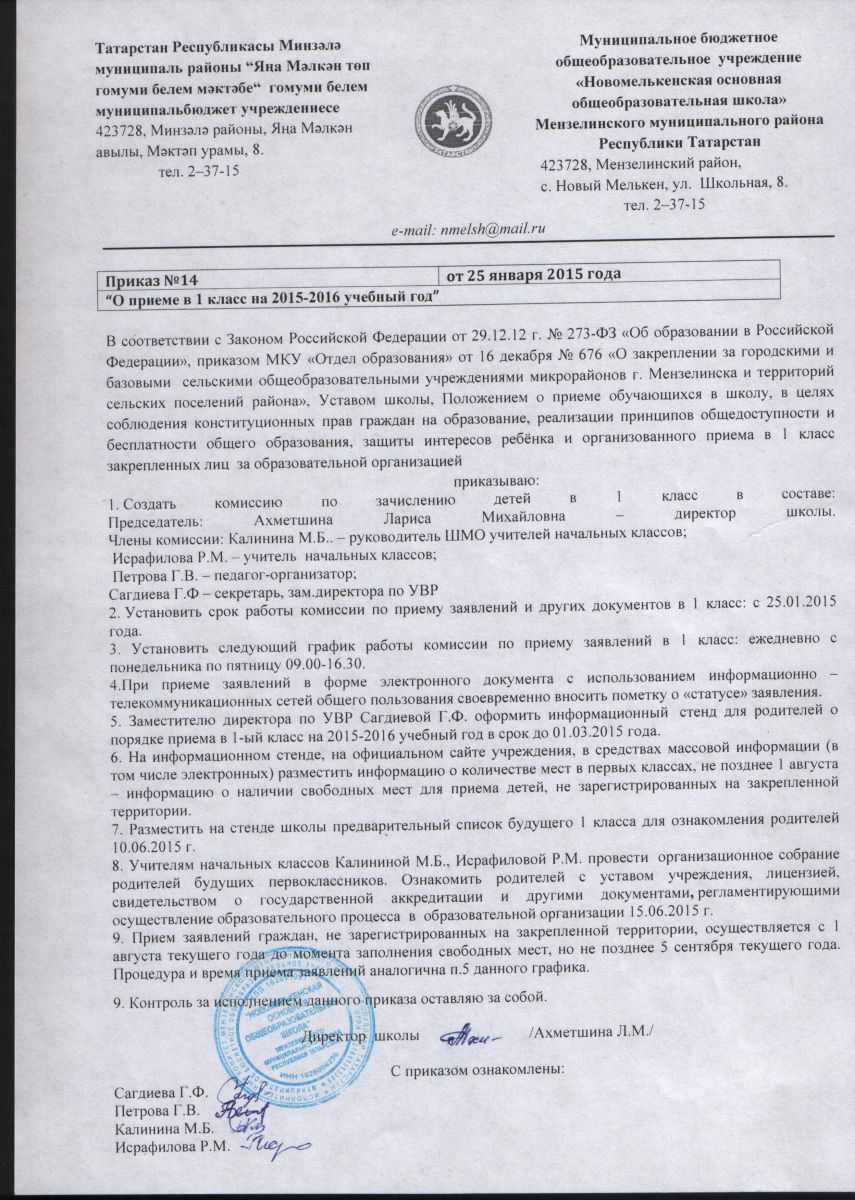 Приказ МБОУ Новомелькенская ООШ "О приеме в первый класс на 2015-2016 уч.год"
