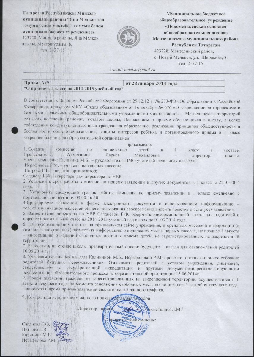 Приказ Новомелькенской ООШ "О зачислении детей в первый класс на 2014-2015 учебный год"