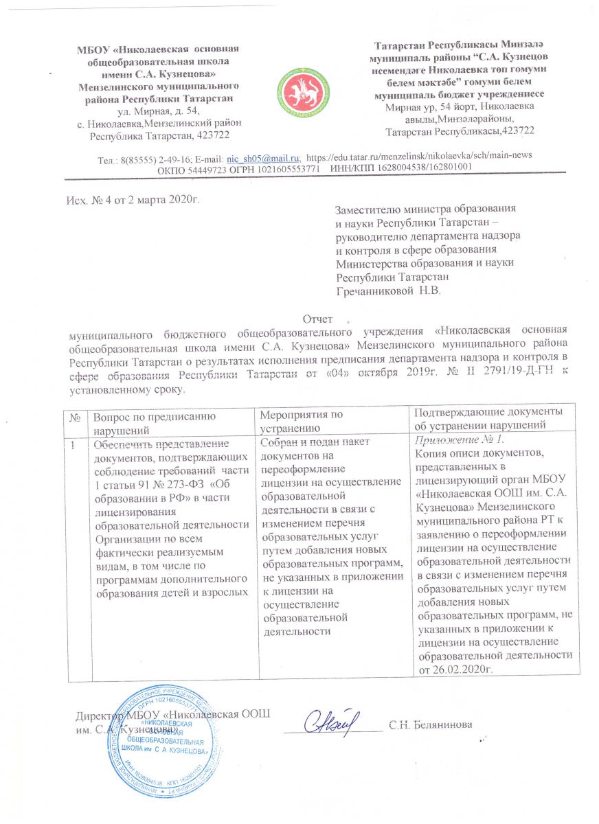 Муниципальное бюджетное общеобразовательное учреждение «Николаевская основная общеобразовательная школа имени С.А. Кузнецова» Мензелинского муниципального района РТ/Татарстан Республикасы Минзәлә муниципаль районы “С.А.Кузнецов исемендәге Николаевка төп гомуми белем мәктәбе” гомуми белем муниципаль бюджет учреждениесе