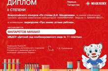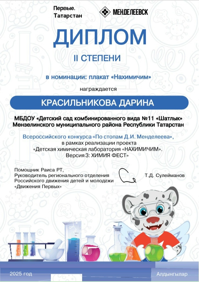 Воспитанники МБДОУ # 11 "Шатлык" Гареев Ислам, Сундрунов Егор, Филаретов Михаил и Красильникова Диана стали участниками Всероссийского конкурса, организованного в рамках проекта «Детская химическая лаборатория „НАХИМИЧИМ“. Версия 3: ХИМИЯ ФЕСТ», который проводится при грантовой поддержке Движения Первых. Проект направлен на развитие интереса детей к химии и естественным наукам, создание условий для раскрытия творческого потенциала и формирования научных представлений о мире веществ. По итогам конкурса Гареев Ислам в номинации: плакат "Нахимичим" занял 2 место, Филаретов Михаил в номинации: видеоролик "Про химию устами ребёнка" занял 2 место, Красильникова Диана в номинации: плакат "Нахимичим" 2 место.