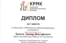 Поздравляем воспитанника Дома детского творчества, учащегося МБОУ "Кузембетьевская СОШ" Бикова Данира, занявшего I место в Республиканском конкурсе детского технического творчества "Моя профессия - моё будущее" в номинации "Монтажник радиоаппаратуры". Благодарим руководителя объединения "Юные физики" Ахмадиеву Гульфарию Салихяновну за подготовку воспитанника в данном конкурсе. Желаем дальнейших успехов и побед!
