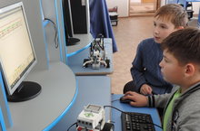 Воспитанники объединения «Робототехника» сегодня готовились к соревнованиям, программируя роботов на определенный маршрут движения и действия. Руководитель объединения Пакшин Игорь Витальевич пояснял сложные компьютерные схемы, чтобы ребята смогли самостоятельно правильно запрограммировать роботов.
