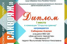 Поздравляем воспитанницу творческого объединения "Рукоделие" Сабирову Азалию занявшую 1 место в региональном конкурсе авторских открыток "Пёстрый саквояж", который проходил в г. Набережные Челны от Союза "Торгово-промышленная палата г. Н.Челны" и МАУ ДО "ДЮЦ" № 14".