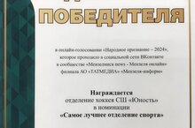 Наша спортивная школа "Юность" стала победителем в онлайн-голосовании "Народное признание-2024" в номинации "Самое лучшее отделение спорта" – хоккей, организованном ИРЦ "Мензеля". 25.03.2025