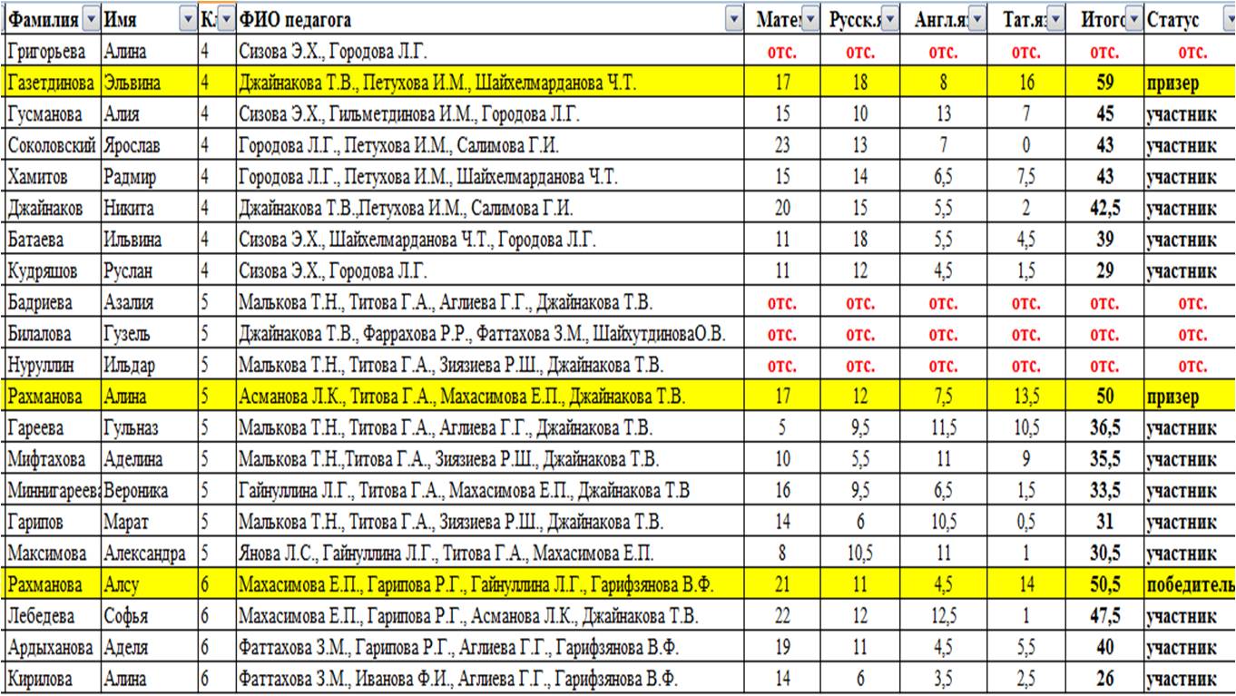 29 апреля на базе Гимназии проходила Республиканская олимпиада среди 4, 5,6 классов по предметам: математика, русский язык, английский язык, татарский язык. Результаты представлены в таблице