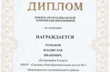 Поздравляем призера Республиканского тура олимпиад - Чумакова Владислава, учащегося 8 а класса, призера олимпиады по экономике. Поздравляем учителя обществознания Ерофееву Ирину Евгеньевну, подготовившую призера!