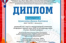 Учащаяся 5В класса Шамсиева Диана стала победителем в Международной олимпиаде "Инфоурок" зимний сезон 2019 по английскому языку (учитель Янова Л.С.)
