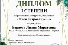 Ученица средней общеобразовательной школы №3 города Мензелинска из 6Б класса Бариева Лилия (учитель татарского языка и литературы Тимиркаева Ольга Анатольевна) принимала участие во Всероссийском конкурсе «Очей очарованье...» и стала лауреатом I степени. На этот конкурс она отправила сказку под названием «Осенняя сказка» , о приключениях Рыжули, ежика и зайчонка, о доброте героев. Только дружба способна творить чудеса!